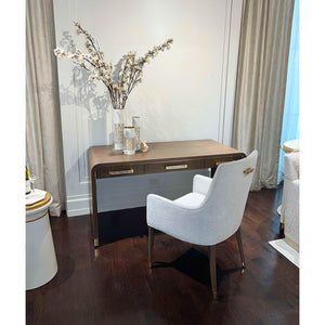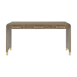 The Dark Hollywood Regency Desk blends timeless form with luxurious detail. Its elegant waterfall silhouette is softened by rounded corners and wrapped in a warm mink wood finish. Polished brass trim outlines the frame, while mother-of-pearl inlaid pulls add a subtle, shimmering touch to the three front drawers.