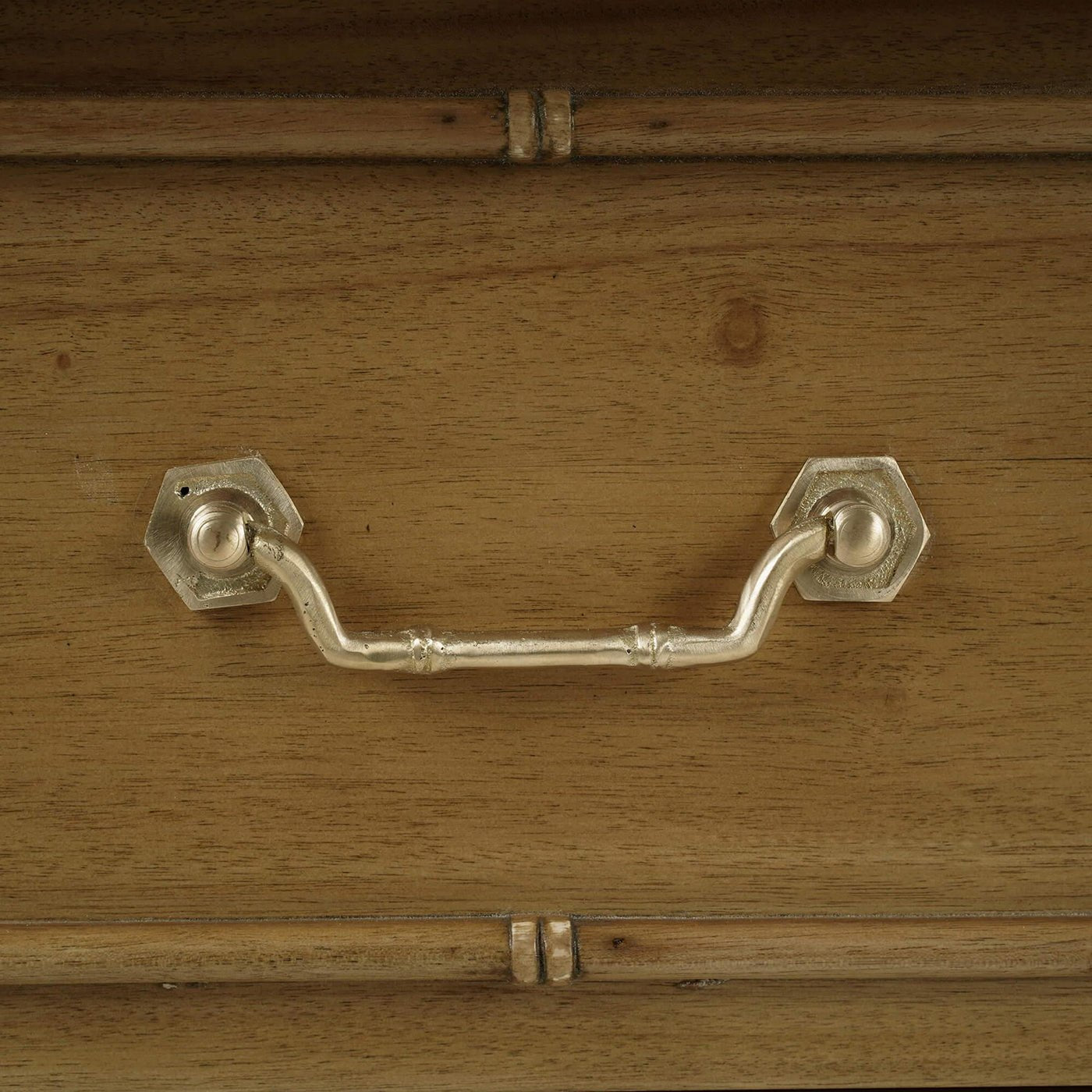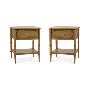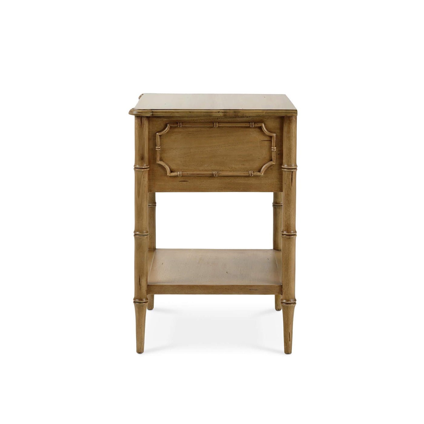 The Faux Bamboo Hollywood Regency End Table adds classic glamour and a touch of tropical style to your bedroom or living space. It is made of solid mahogany, has a turret-cornered top, carved bamboo-style details on the legs and drawer trim, and a warm Antique French Oak finish that adds character.