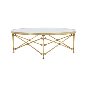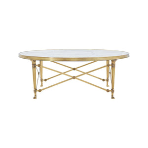 The X-frame stretcher adds structural harmony and is embellished with roundel medallions, reflecting neoclassical symmetry and decorative purpose. This coffee table is an impeccable choice for interiors that seek a regal focal point while maintaining timeless sophistication.