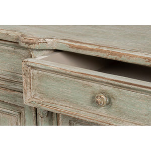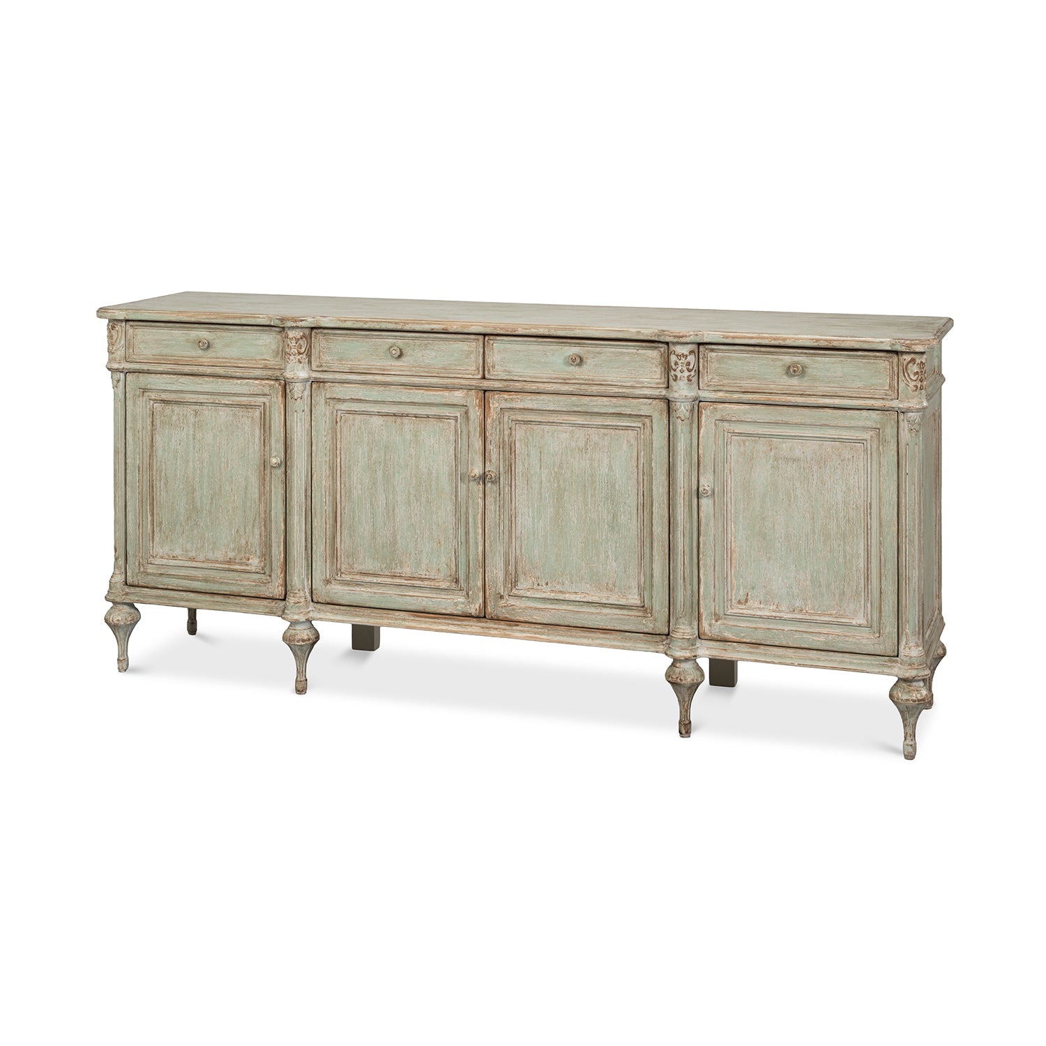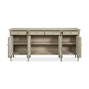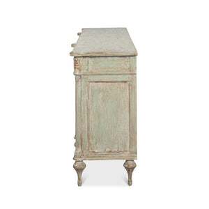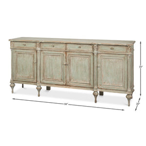 The French Provincial Sage Painted Buffet Sideboard brings refined countryside elegance to classic interiors through its soft-painted and distressed finish and richly detailed craftsmanship. Made from pine with a distressed, aged finish, it features four paneled doors and four upper drawers, creating a balanced, welcoming look. Fluted columns, delicate floral carvings on the corners, and tall carved tapered feet give it a graceful, relaxed style that fits the French Provincial tradition.