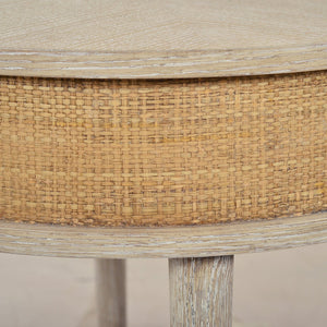 Enhance your living space with the Himalaya Round Side Table, a perfect fusion of natural texture and modern design. This elegant Coastal style table features the Himlaya finish, a round wood top with a raffia-wrapped apron, adding warmth and sophistication. The shaped stretcher connects its round, tapered legs, while slightly textured pewter finish ferrules provide a refined touch of contrast.