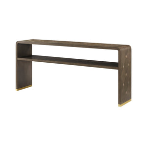 A full-length lower shelf adds versatile display space while maintaining a clean, minimalist profile. Brass-capped feet lend a final touch of polished glamour, making this table ideal for entryways, living rooms, or gallery-like settings.