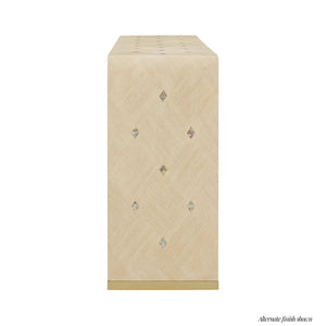 This Hollywood Regency Console Table, in a dark mink finish, bring sculptural elegance to refined interiors. Its waterfall-edge silhouette is accented with delicate diamond-pattern inlays across the top and sides, creating a soft sense of movement.