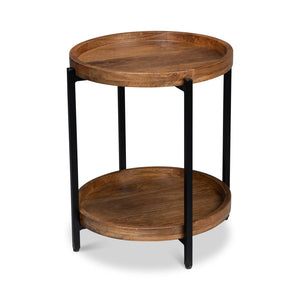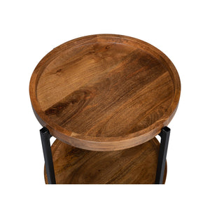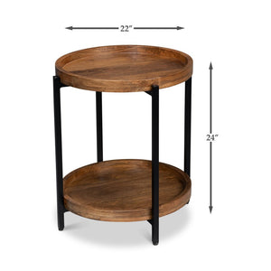 Enhance your home with the simple elegance of the Industrial Round Side Table, a perfect blend of industrial design and natural beauty. This table features a sleek iron frame in a black finish, paired with rich mango wood for the round dish top and lower shelf.