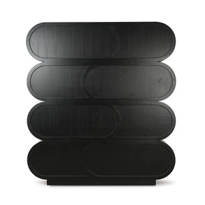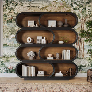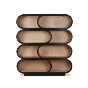 Boldly sculptural and Geometric, the Infinity Modern Open Bookcase offers a fresh perspective on functional design. Composed of a rhythmic stack of oval compartments, this bookcase creates visual impact through form and contrast. Shown in a rich Batavia Black exterior with a warm fruitwood interior, each capsule-shaped shelf can showcase books and objects like curated art.