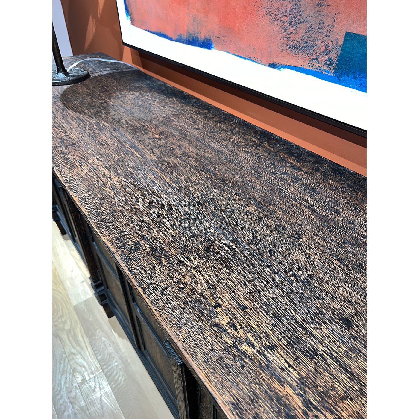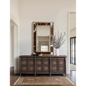 Hand-cast brass knobs with an aged patina introduce a subtle metallic contrast, while the wire-brushed finish enhances the natural depth of the oak grain. Three framed drawers with wood interiors, four carved panel doors, and adjustable shelving behind each section offer practical, versatile storage suited for dining rooms, living spaces, or entry halls. Square tapered legs with recessed molding complete the architectural silhouette, giving this sideboard an air of permanence and timeless craftsmanship.