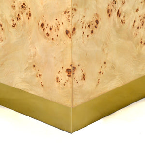 Introduce bold elegance to your space with the Light Burl Wood Cube Table. Designed with clean, modern lines, this cube-shaped table is wrapped in luxurious mappa burl wood veneer in a clear gloss polish, showcasing its intricate wood grain. The base is accented with a gleaming brass plinth, adding a touch of glamour to its minimalist design.