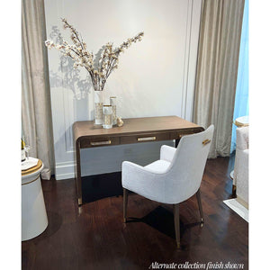 The Light Hollywood Regency Desk blends timeless form with luxurious detail. Its elegant waterfall silhouette is softened by rounded corners and wrapped in a light wood martini finish. Polished brass trim outlines the frame, while mother-of-pearl inlaid pulls add a subtle, shimmering touch to the three front drawers.