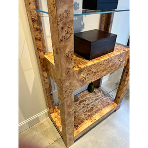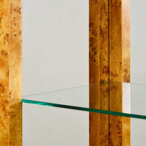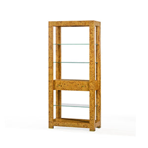 Elevate your home decor with this exquisite Mid Century Style Burl Étagère Bookshelf. Crafted from stunning mappa burl wood, this piece is both a functional storage solution and a statement of timeless elegance.