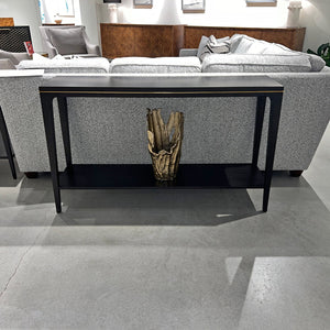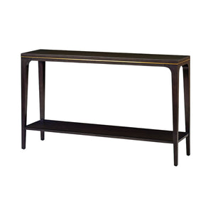 Elevate your home decor with the Mid Century Console Table, crafted to perfection for the modern homeowner. Featuring a smooth top and a sculpted apron adorned with a sleek brass accent.