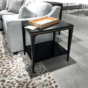 Elevate your home decor with the Mid Century End Table, crafted to perfection for the modern homeowner. Featuring a smooth top and a sculpted apron adorned with a sleek brass accent.