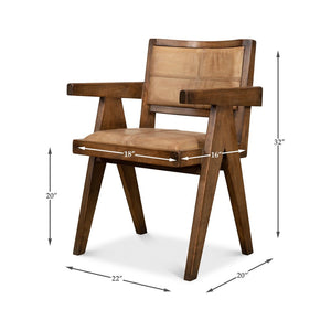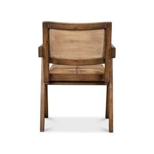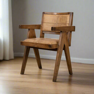 Inspired by the iconic designs of Swiss architect Pierre Jeanneret, this Mid Century Modern Armchair embodies the timeless elegance of the mid-twentieth century. Made from solid pine, the chair features a warm brown finish that enhances the wood's beautiful texture and grain.