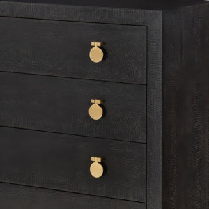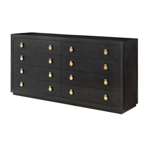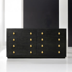 The Modern Black Eight Drawer Dresser with polished brass hardware showcases the distinctive texture of black lacewood veneer that is enhanced by a deep ebony finish. The streamlined design features eight drawers, each adorned with contemporary brass pulls that provide an elegant contrast to the dark finish.