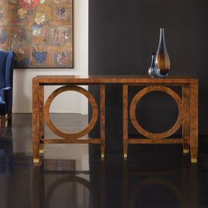 The Modern Burl Walnut Console Table showcases its beauty through clean geometric shapes and rich wood patterns. Its hand-rubbed polished finish highlights two big circles set inside straight frames, and brass caps on the feet add a nice finishing touch.