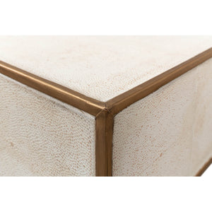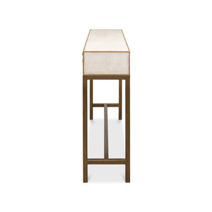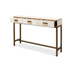 Modern Osprey White Leather Wrapped Console with gilt trim, three frieze drawers with marbleized interiors, brass handles and raised on H stretcher base.