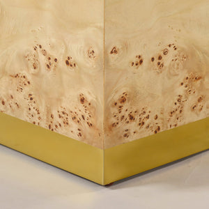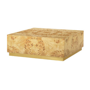 The Modern Square Light Burl Wood Coffee Table features richly textured Mappa burl veneer with a light clear polished finish that highlights its naturally occurring swirls and patterns. The striking cube-shaped design celebrates clean geometric lines, while the sleek brass plinth base provides an elegant foundation that appears to float the dramatic wood form above the floor.
