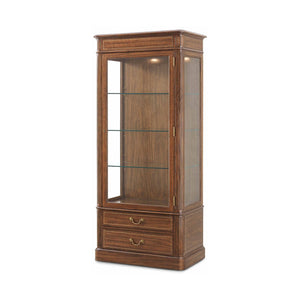 A glass door and side panels reveal adjustable glass shelves within, offering the perfect setting for displaying treasured collections, books, or art. An integrated downlight provides soft illumination, enhancing the cabinet's contents while adding warmth and elegance to any room. With two lower drawers for additional concealed storage. This display bookcase brings a graceful vertical presence and historic charm to formal living rooms, libraries, or dining spaces.