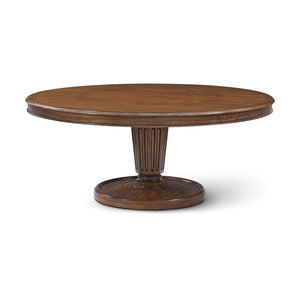 The Regency Style 72 Inch Round Dining Table draws upon the grandeur of historic English design, masterfully crafted with figured walnut with a rich warm heirloom finish. The expansive round top has a built-in Lazy Susan and sits on a sculptural pedestal base that is both reeded and tapered, offering a refined nod to neoclassical forms. Classic brass detailing subtly accents the top, adding warmth and elegance without overpowering the table's graceful profile.