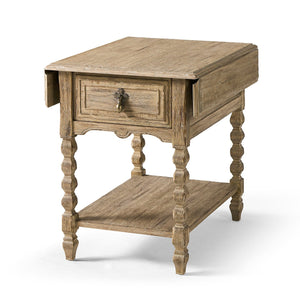 The turned geometric legs give the table a sculpted look and hold up a roomy lower shelf, great for books, baskets, or decorations. The soft-close drawer keeps small items out of sight, so the table stays neat and useful. This dropleaf side table works well next to a sofa, armchair, or bed, blending rustic style with careful craftsmanship for a lasting, collected feel.