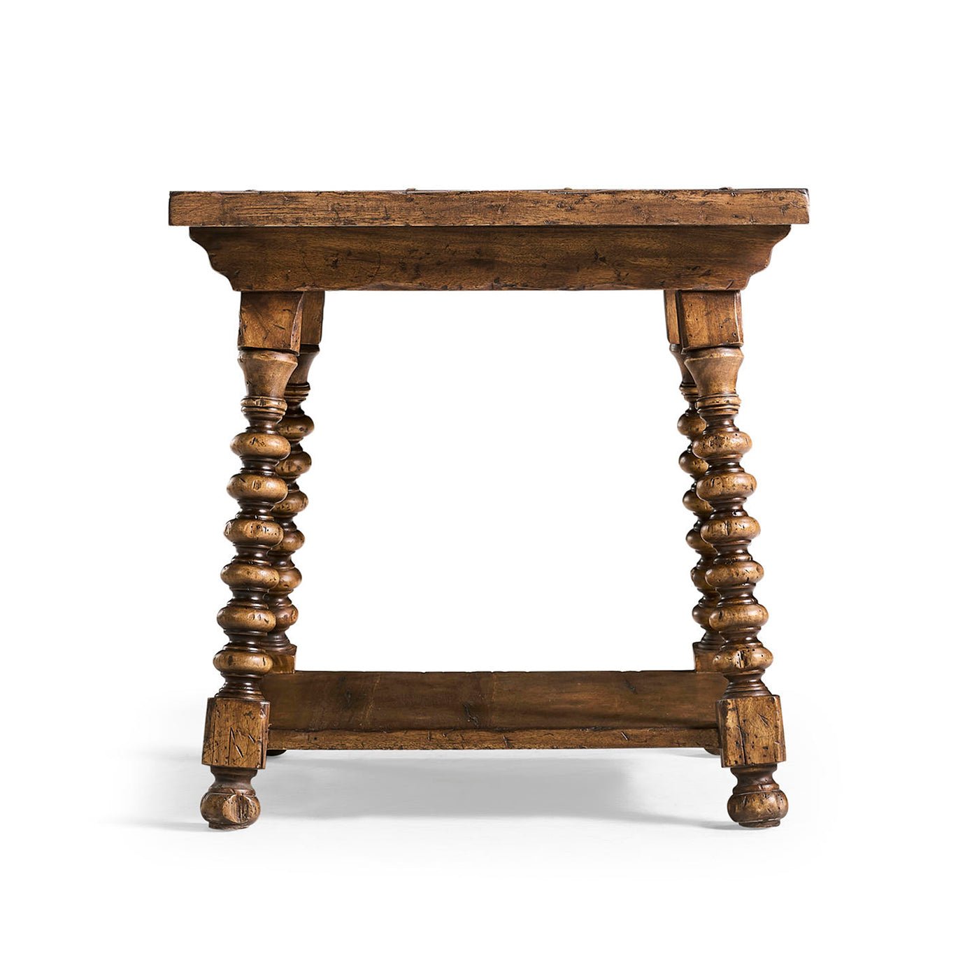 The Rustic Farmhouse Spool-Leg Side Table combines classic craftsmanship with practical design for your home. Its warm medium walnut finish highlights the natural wood grain and gently worn edges, giving it a vintage look. Antique-style nailhead trim and a wire-brushed surface add extra texture and a handcrafted feel.