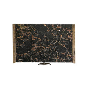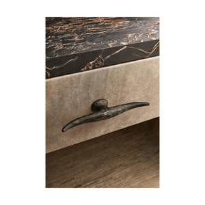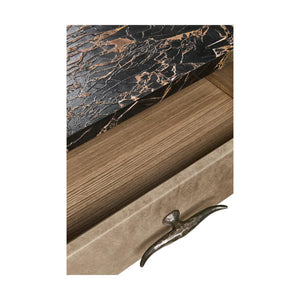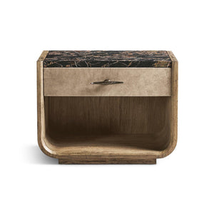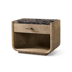 The nightstand has one drawer for hidden storage, wrapped in textured grey-brown leather for a rich feel next to the wood. On top, a handcrafted marble surface, treated for durability, brings a natural touch of luxury. Each piece is unique because of the marble’s natural veining. The mix of stone, leather, and wood makes this nightstand a versatile accent for both rustic and modern spaces that want a warm, natural look.