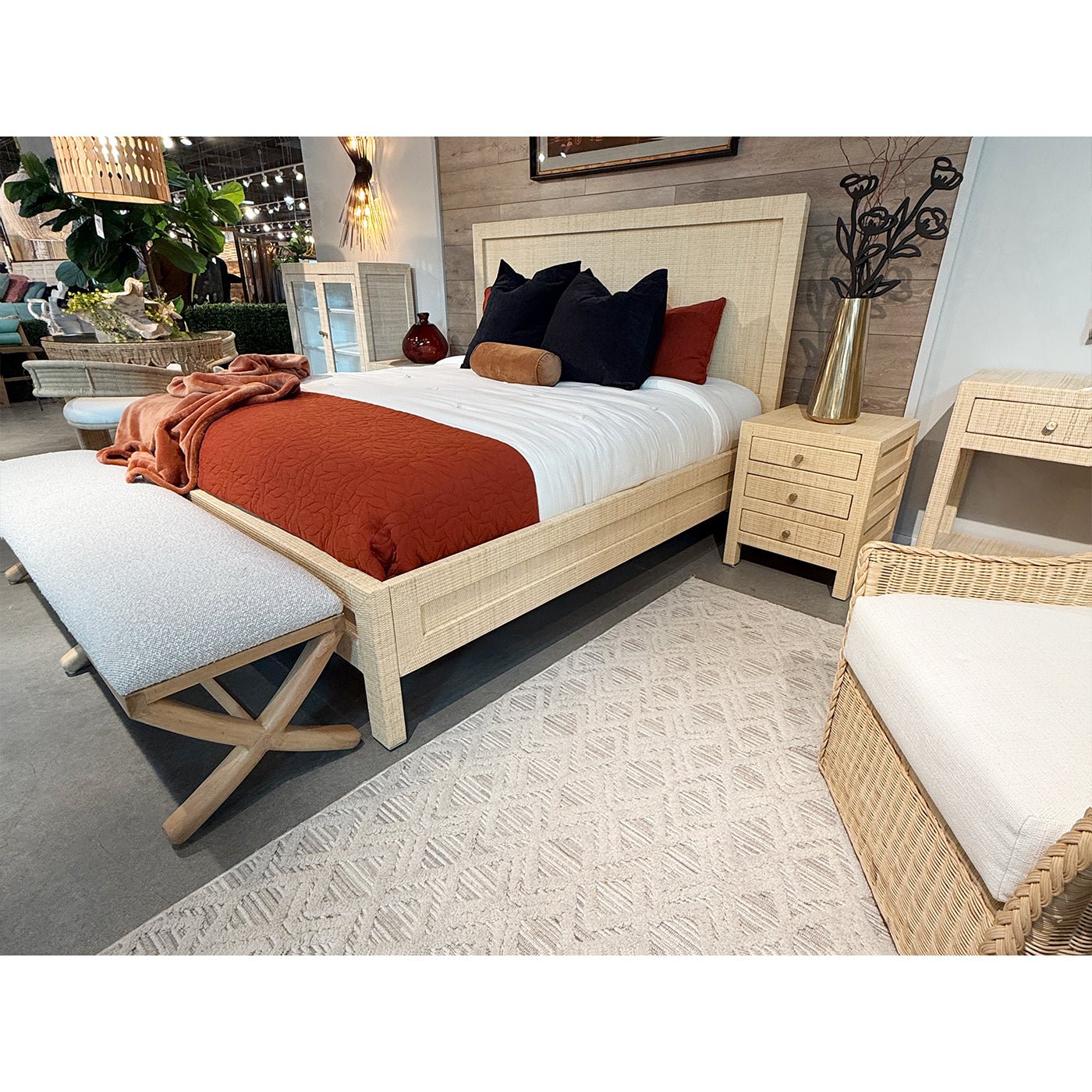 The Scandinavian Minimalist Bench with Upholstered Seat shows off a simple, balanced design that fits well in both modern and transitional spaces. Its long shape sits on a sculpted X-base frame made from mahogany with a warm fruitwood finish, bringing in natural warmth without feeling heavy. The cushioned seat, covered in Sand bouclé, adds both texture and comfort, giving the bench a calm, natural look.