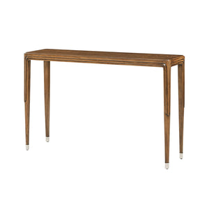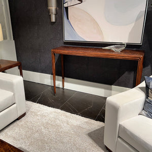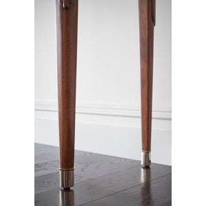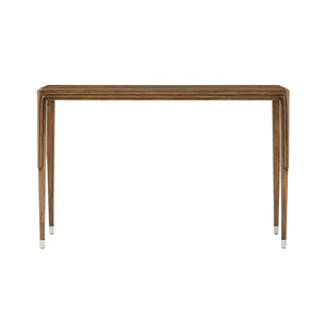 Slender, tapered legs with subtle metallic-capped feet evoke the sleek geometric forms of the Art Deco era, making this table a striking statement piece for any entryway, hallway, or living space.