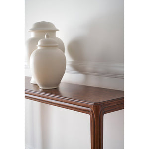 The Walnut Art Deco Console Table embodies the refined elegance of early 20th-century design. With a slender, decorative motif and a sculptural presence, this piece is a testament to timeless sophistication. The rich figured walnut veneer, finished in a luxurious Mayfair stain, accentuates the natural beauty of the wood grain while enhancing its vintage allure.