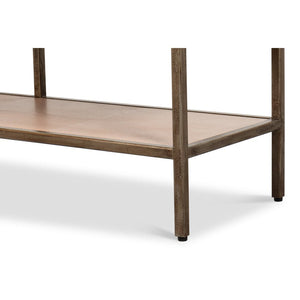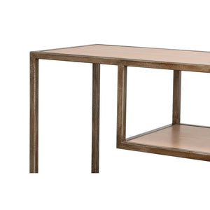 The Antique Bronzed Console Table with Mushroom Leather combines modern sophistication with timeless luxury. Its sleek, antique bronzed metal frame features a minimalist, open design that creates a sense of lightness and elegance. The mushroom cream shagreen embossed leather-wrapped shelves add refined texture and a rich, warm tone, offering a beautiful contrast to the metallic frame.