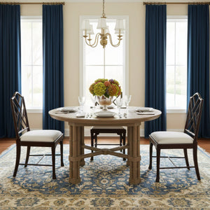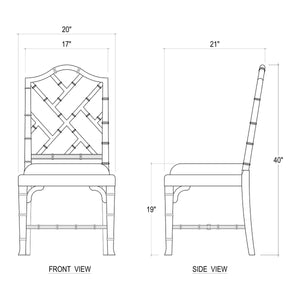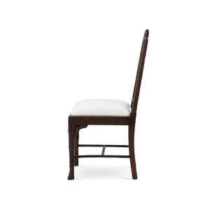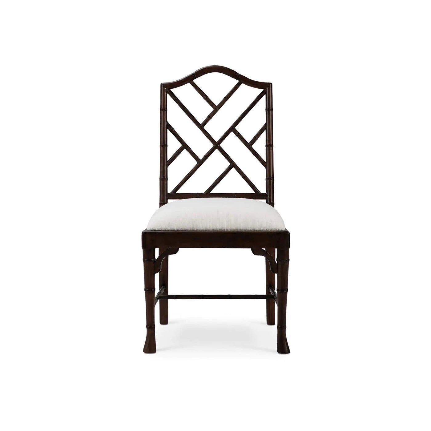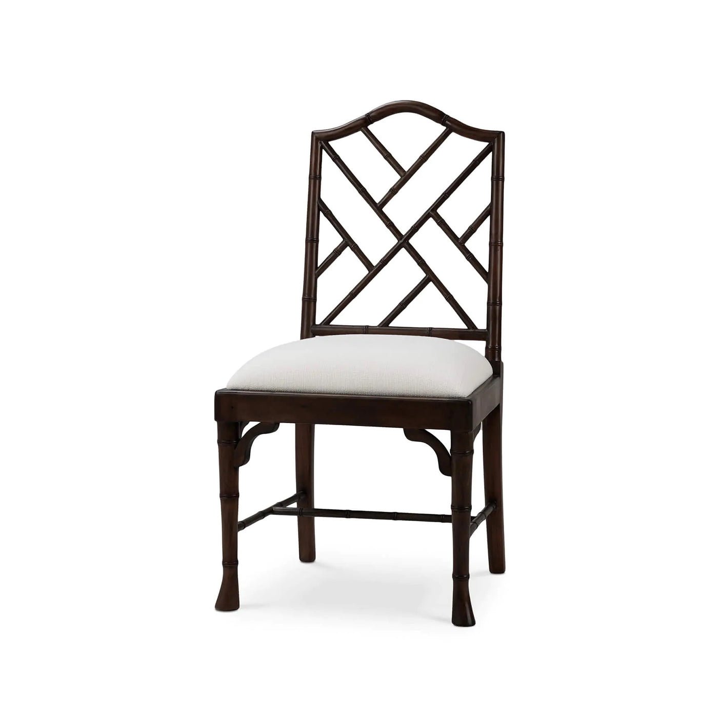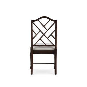 The Chippendale Faux Bamboo Dining Chair exemplifies timeless craftsmanship and refined elegance. Expertly crafted from solid mahogany and finished in a dark walnut stain, it reflects the graceful geometry and artistry of 18th-century Chinese Chippendale design. The hand-carved faux bamboo frame and open lattice back showcase intricate detailing, while the slightly flared legs lend a balanced, architectural profile.