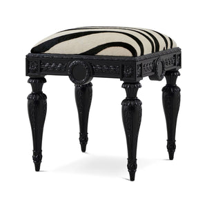 The French Louis XVI Black Carved Zebra Vanity Stool merges neoclassical artistry with modern boldness. Crafted in the style of 18th-century France, this piece features intricately hand-carved floral rosettes, fluted legs, and guilloche-style motifs. Its deep black lacquered frame exudes refinement, while the zebra-patterned upholstered seat adds a striking contemporary flair.