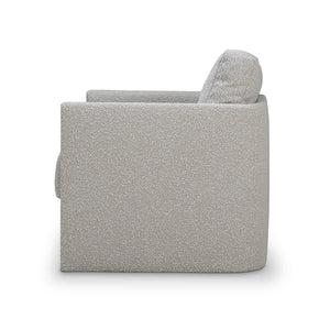 Introducing our French Modern Boucle Swivel Armchair, the perfect blend of contemporary design and luxurious comfort. This exquisite armchair features a sleek, modern frame upholstered in premium boucle sand fabric. The solid wood accents, finished in a rich straw wash, add warmth and sophistication, making this chair a standout piece in your home decor.