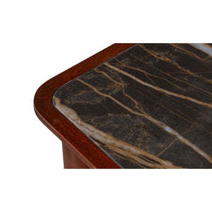 Finished in a warm tone, the wood’s rich character is beautifully complemented by a dark Nero porcelain top with softly rounded corners. The contrast between the dark finish and the stone surface adds depth and sophistication. Three spacious drawers provide generous storage and are accented with aged brass hardware, balancing beauty with everyday utility.