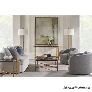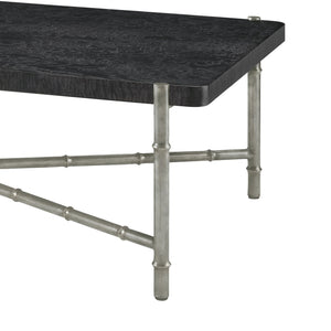 Mid Century Black Burl Top Coffee Table, slender lines form a light and airy design in the modern coffee table. A graceful combination of Tamo ash wood in a dark silent black finish atop an organic faux bois base.