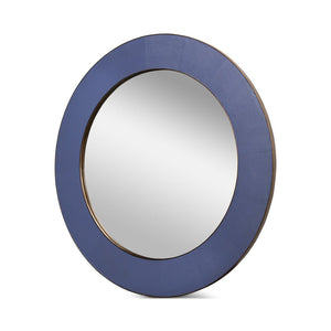 The Mid Century Purple Round Leather Mirror is a bold statement of retro elegance and modern craftsmanship. Wrapped in vibrant Marlin purple shagreen embossed leather, the frame is adorned with handcrafted gold accents, adding a touch of timeless sophistication. At its center, the beveled mirror enhances the design with added depth and a polished, luxurious finish.