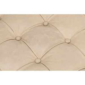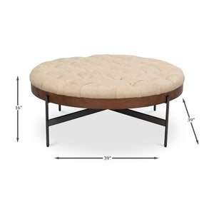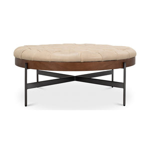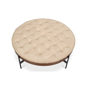 The Modern Cocktail Ottoman is a harmonious blend of luxury and timeless design. Featuring a button tufted top crafted from premium Cappuccino White top-grain leather, it offers both comfort and style. The elegantly finished wood base and trim add warmth, while the sleek metal legs provide contemporary sophistication and stability.