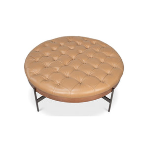 The Modern Cocktail Ottoman - Caramel Brown Leather is a harmonious blend of luxury and timeless design. Featuring a button tufted top crafted from premium top-grain leather, it offers both comfort and style. The elegantly finished wood base and trim add warmth, while the sleek metal legs provide contemporary sophistication and stability.