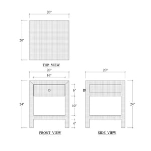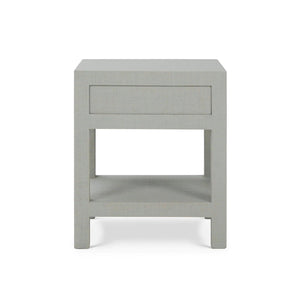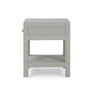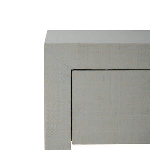 Upgrade your bedroom with our Chic Pale Blue Wash Raffia Wrapped Nightstand. Wrapped in natural pale blue washed Raffia, this stunning table combines modern design with coastal charm. It features spacious drawers for all your storage needs and an open lower shelf perfect for displaying your favorite decor items.