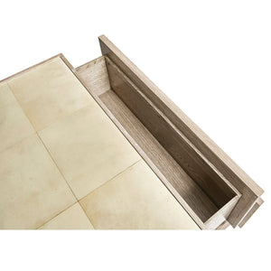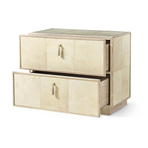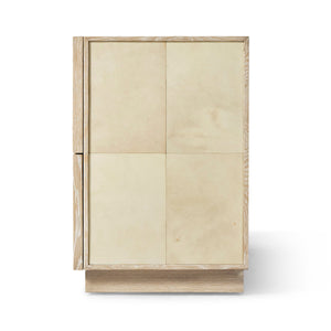 Organic Modern Nightstand, a stunning bedside table that epitomizes chic functionality and natural elegance. Framed with robust oak, known for its durability and graceful aging, that is adorned with genuine, untreated parchment squares that are meticulously sealed with a clear coat, offering a durable yet luxuriously smooth finish.