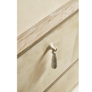 Beyond its aesthetic appeal, it features two spacious drawers to keep your essentials organized and within reach. The cast brass tassel drawer pulls, provide a tactile delight and contribute to the piece's overall charm.