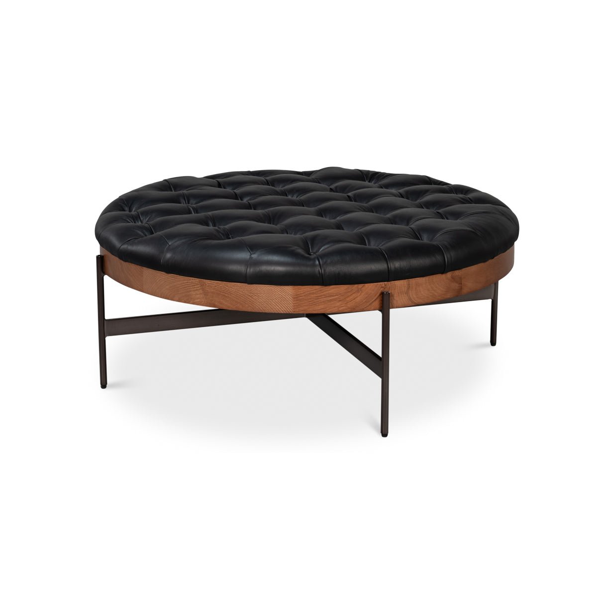 The Modern Black Leather Cocktail Ottoman is a harmonious blend of luxury and timeless design. Featuring a button tufted top crafted from premium top-grain leather, it offers both comfort and style. The elegantly finished wood base and trim add warmth, while the sleek metal legs provide contemporary sophistication and stability.
