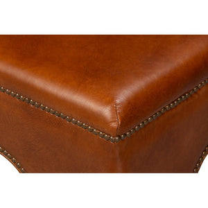 The Square Brown Leather Cocktail Ottoman is a refined blend of timeless elegance and functional design. Upholstered in rich and bold Havana Brown color leather, it features a smooth, paneled top that doubles as a stylish coffee table or extra seating. Its classic scalloped apron adds an element of sophisticated charm, while the nailhead trim enhances its artisanal appeal.