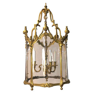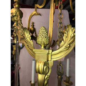 A fine French Louis XVI gilt bronze three arm hall lantern with serpentine sides, bronze swags, flame urn for finials, acorns, and acanthus leaf decorations. ca 1880