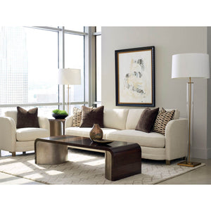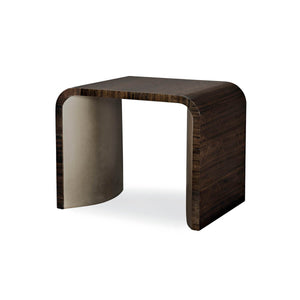 Art Deco Style Side Table, with fumed figured eucalyptus wood, finished to a high sheen in Aged Bourbon, is draped over the top of this rectangular table that is distinguished by its absence of sharp angles. Two large, half-moon-shaped pedestals are covered in Smoked Bronze. This is a piece with smooth, elegant, retro curves reinterpreted for today.
