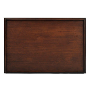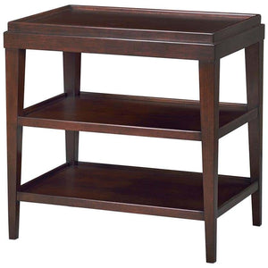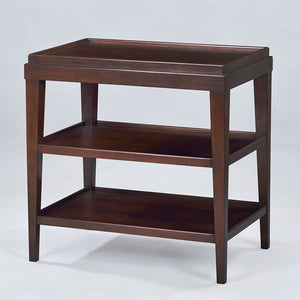 A Classic style rustic dark mahogany stained three tier end table with a slightly distressed finish, a wooden galleried dish top with square tapered legs.