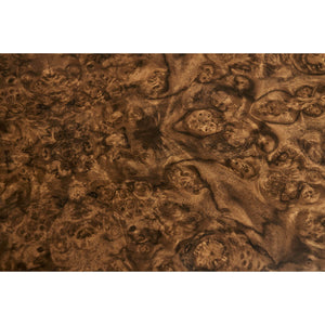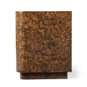 French Modern Burl Wood End Table, a stunning piece showcasing the timeless beauty of book-matched walnut burl veneer. The square table design is enhanced by a unique rounded radius end in one corner, lending a modern yet refined aesthetic to the piece. This distinctive feature not only adds visual interest but also creates a dynamic focal point.