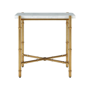 Mid Century Marble Top End Table, slender lines form a light and airy design in the modern Side Table. A graceful combination of honed white bianco marble atop an organic faux bois base in a satin bronze finish.