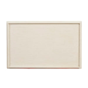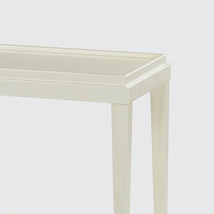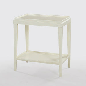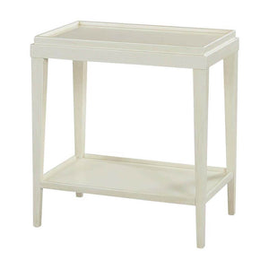 Small Classic rectangle two-tier side table with lipped top, tapered legs, and a shelf, has a “drift” white painted finish with subtle grey distressing on acacia crown veneer and acacia solids.