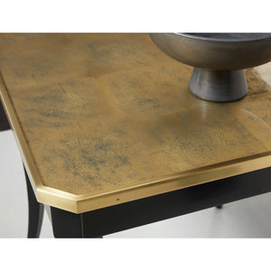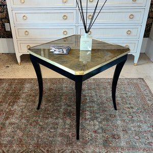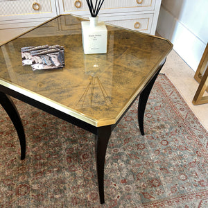 Discover luxury and sophistication with our chic Square Mid Century End Table. This exquisite piece seamlessly blends classic style and contemporary flair, featuring a magnificent glass top with a golden eglomise finish that radiates elegance. The table's square gold top, edged with refined brass trim, creates a stunning visual contrast with its sleek, black lacquered incurved legs. These legs are elegantly tapered, infusing a modern touch of sophistication into any space.