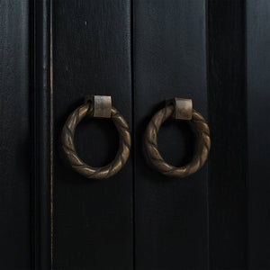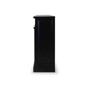 The cabinet is raised on a square plinth base and is accented with charming bronze handles and pulls, adding a refined touch to the overall design. The Batavia Black Rustic Country Sideboard is the perfect addition to any living or dining space, combining practicality with timeless beauty.